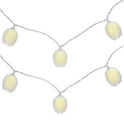 Decorate your home with these fun cracked Easter egg lights. The white eggs are cracked open and illuminated from the inside by warm white micro LED lights that sit upon discreet clear wire. Perfect for your Easter decorating needs! Product features:Color: warm white bulbs / clear wireCracked Easter egg light coversNumber of bulbs on string: 10Bulb size: micro wide angleBulb type: LEDSpacing between each bulb: 6″Lighted length: 4.5’Total length: 5.5’12” lead cordAdditional product features:LED lights use 90% less energyBulbs stay cool to the touchFor indoor use onlyRequires (2) ‘AA’ size batteries – not includedConvenient on/off switch on the battery packNon-replaceable bulbsCannot connect multiple sets togetherEaster egg dimensions: 2.25″ high x 1.5″ diameterMaterial(s): plastic/wire