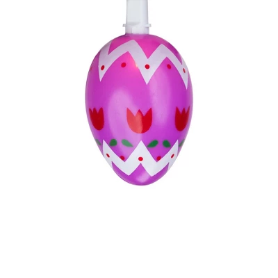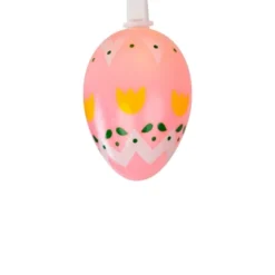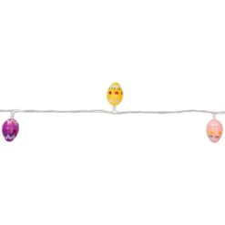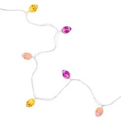 Add some glow to your Easter event with this string of egg-shaped lights. Each light bulb is covered with either a yellow, pink or purple decorated egg-shaped cover. The UL listing allows for these to be used both indoor and outdoor. They’re a fun way to decorate any room, window, buffet or Easter party table with color and light.Product features: Color: clear bulbs / white wire Multi-color egg-shaped light covers Number of bulbs on string: 10 Bulb size: mini Spacing between each bulb: 10″ Lighted length: 7.25′ (approximately)Total length: 9.5′ (approximately)24″ lead cord4″ tail cordAdditional product features:If one bulb burns out, the rest will stay lit Contains end-to-end connectors which allows you to connect multiple sets together (not to exceed 210 watts)Comes with replacement bulbs and spare fuseUL certified and approved for indoor or outdoor useWire gauge: 22120 volts, 60 hertz, 0.08 amps, 9.6 watts Light cover dimensions: 2.5″H x 1.75″WMaterial(s): plastic/wire/glass bulbs