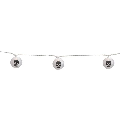 Illuminate your patio or porch with these paper lantern lights. This strand of clear mini lights has white paper lantern covers with a black skeleton skull design. These lights will be the perfect addition to your Halloween party. The mini light will shine brightly through the lanterns, lighting up any space. Product Features:White paper lantern Halloween light set with a black skull designColor: clear bulbs / white wireNumber of bulbs on string: 10Bulb size: miniBulb type: incandescentSpacing between each bulb: 12″Lighted length: 8.75′ Total length: 11’24” lead cord5″ tail cordAdditional Product Features: Super bright bulbsUL certified and approved for indoor or outdoor useIf one bulb burns out, the rest will stay litComes with replacement bulbs and spare fusesContains end-to-end connectors which allows you to connect multiple sets together (not to exceed 210 watts)120 volts, 60 hertz, .06 amps, 7.2 watts Lantern Dimensions: 3″ high x 3″ diameterMaterial(s): plastic/metal/paper