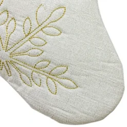A lovely addition to your home this holiday season is this sparkling stocking! The white fabric is enhanced with silver thread to make this a dazzling accessory perfect for the holidays. Hang this gorgeous holiday stocking from your mantles, stairwells, and windows.Product Features:Cream, white, silver, and gold holiday stockingCream and white stocking accented with silver threadsVarious sized gold stitched snowflakesWhite faux fur cuff with a pom-pomPom-pom dangles from a gold cordFeatures gold embroidered snowflakes Stocking has a one-sided designComes ready-to-hang on a matching white loopRecommended for indoor decorative use onlyCare instructions: spot clean with mild detergent; do not washDimensions: 20″ high x 10″ wideMaterial(s): polyester/faux fur