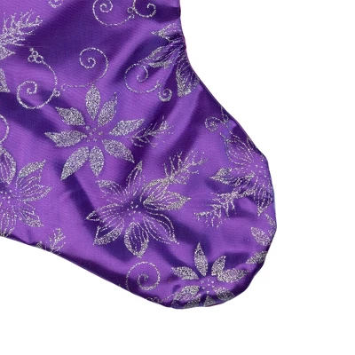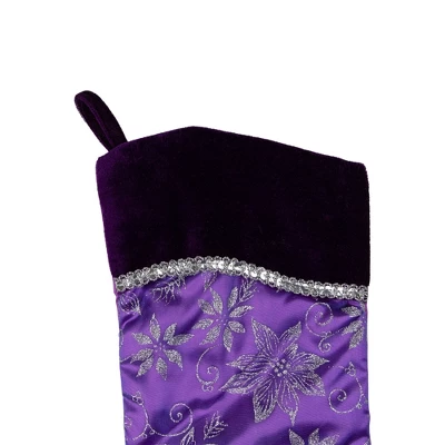 Carry on a holiday tradition with this stocking that can hang anywhere in your home! Features a purple floral holiday stocking with a silver trimmed cuff and faux fur. It will add a pop of color and sparkle to your holiday decor. Product Features: Purple holiday stocking Features a glittery floral design Stocking features a sheer purple organza overlay Trimmed with a deep wavy purple velveteen cuffCuff designed with a silver sequin trim Design is on front only; solid purple velvet backing Comes ready-to-hang on a purple fabric loop Care instructions: Spot clean with mild detergent onlyFor indoor use onlyDimensions: 20.5″ high x 10″ wide (including loop) Material(s): polyester/velvet/glitter