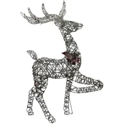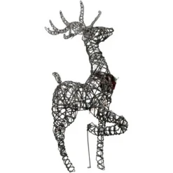 Everyone loves reindeer for their magic and beauty. This beautifully crafted pre-lit reindeer will add the perfect dose of sparkle to your holiday. Complete with a red bow around his neck, he will be perfect for your porch, lawn or anywhere you to add some holiday charm.Product Features:Reindeer lighted holiday decorationPre-lit with 80 clear lightsBulb size: miniBulb type: incandescentIf one bulb burns out, the rest will stay litContains 1 plug with an end connector which allows you to stack multiple lighted items together (210-watt max)Comes with replacement bulbs and spare fusesSome assembly required; ground stakes not includedUL approved and certified for indoor or outdoor useRecommended for outdoorDimensions: 60.25″H x 38″W x 12.5″DMaterial(s): metal/plastic/fabric