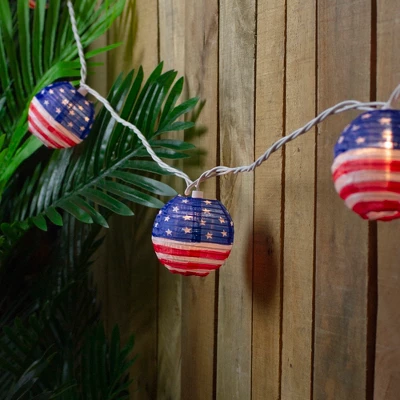 Add a touch of patriotic charm to your outdoor space with our American flag-themed paper lantern patio lights. These festive Independence Day lights beautifully showcase the stars and stripes, creating a warm and inviting ambiance for your gatherings and celebrations. Whether you’re hosting a Fourth of July barbecue or simply enjoying a summer evening under the stars, these lantern lights will effortlessly enhance the atmosphere. Durable and weather-resistant, they are perfect for illuminating your patio, deck, or garden this Memorial Day, July 4th, and all season long. Bring a dose of Americana to your outdoor decor and let the stars shine bright with our American flag paper lantern patio lights.Product Features:Bulb color: clear bulbs / white wireBulb size: miniBulb type: incandescentNumber of bulbs on string: 10Spacing between each bulb: 12″Lighted length: 8.5’Total length: 11’6″ tail cord24″ lead cordAdditional Product Features:If one bulb burns out, the rest will stay litContains end-to-end connectors which allows you to connect multiple sets of lights together (not to exceed 210 watts)UL certified and approved for indoor or outdoor useComes with replacement bulbs and spare fuseWire gauge: 22120 volts, 60 hertz, .06 amps, 7.2 wattsLantern Dimensions: 3″ high x 3″ diameterMaterial(s): paper/plastic/glass bulbs/wire