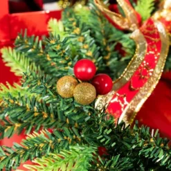 Bring festive charm to your holiday decor with this animated and musical Santa decoration. Santa waves along to the cheerful tune of “Jingle Bells” while sitting in a red vintage truck, adorned with copper accents. The truck’s bed is packed with Santa’s bag of gifts and a beautifully lit holiday tree, adding to the holiday spirit. A pine wreath with a red and gold bow on the front completes the classic look, making this a joyful and nostalgic centerpiece for any holiday display.Product Features:Santa Claus holiday decorationTree is pre-lit with warm white LED micro lightsSanta waves to the song Jingle BellsShowcases a red vintage truck with copper accentsInside the truck is a Santas bag full of gifts and a holiday treeFront of car is accented with a pine wreath with a red and gold bowRequires 3 “AA” batteries – not includedBattery pack is located on the gold presentFor indoor use onlyDimensions: 24″H x 36.5″W x 16.5″D Material(s): metal/plastic/fabric