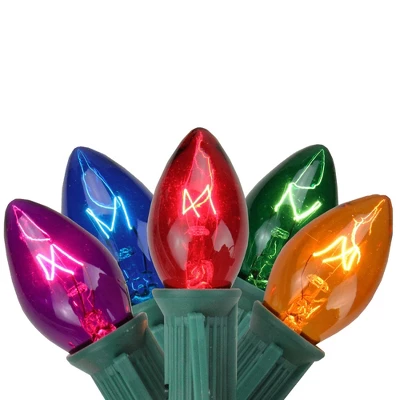 Add some vibrant light to your home with these multi-color C7 holiday lights. The eye-catching glow of these incandescent holiday lights will bring some sparkle to your holiday tree, garland, or wreath. They can also be used at parties, adding bold pops of color.Product Features:Color: transparent multi-color bulbs / green wire Multi-color consists of red, green, blue, amber and pink bulbsNumber of bulbs on string: 25Bulb size: C7Spacing between each bulb: 12″Lighted length: 24’Total length: 25’6″ lead cord6″ tail cordAdditional Product Features:If one bulb burns out, the rest will stay litContains end-to-end connectors which allows you to connect multiple sets together (not to exceed 210 watts)Comes with replacement bulbs and spare fusesUL certified and approved for indoor or outdoor useWire gauge: 20120 volts, 60 hertz, 1.04 amps, 125 wattsMaterial(s): glass/plastic/wire