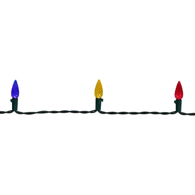 Experience the magic of the holiday season with our LED faceted C6 holiday lights. These vibrant and versatile lights feature a rainbow of multi-color hues that will add a festive touch to any space. Battery operated for convenience, they’re perfect for decorating trees, wreaths, or any corner of your home. These charming lights will create a merry atmosphere that will delight all who see them.Product Features:Color: multi-color bulbs / green wire Number of bulbs on string: 50Bulb size: C6Bulb type: LEDSpacing between each bulb: 4”Lighted string length: 15.75’Total string length: 16.75’12” green lead cordAdditional Product Features:For indoor use onlyLights are equipped with Lamp Lock feature, which makes them replaceable, interchangeable and keeps them from falling outIf one bulb burns out, the rest will stay litStraight line constructionRequires 3 “AA” size batteries (not included)Comes with replacement bulbsOn/off switch located on the back of battery packCannot connect multiple sets together8 functions include:CombinationIn WaveSequentialSlo gloChasing/flashSlow fadeTwinkle/flashSteady on