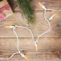 Create a cozy holiday atmosphere with warm white LED C7 holiday lights. Perfect for decorating trees, mantels, or outdoor displays, these energy-efficient bulbs offer a soft, inviting glow that enhances your seasonal decor. Built to last, they stay cool to the touch and maintain their brightness year after year, making them an ideal choice for both indoor and outdoor festive setups. Add a timeless warmth to your celebrations with these reliable and long-lasting lights.Product Features:Color: warm white bulbs / white wireNumber of bulbs on string: 25Bulb size: C7Bulb type: LEDSpacing between each bulb: 8″Lighted length: 16’Total length: 17’6″ lead cord6″ tail cordAdditional Product Features:LED lights use 90% less energyDurable non-glass replaceable bulbsCool to the touchEach socket has a clip on it for securing to trees or other surfacesUL certified and approved for indoor or outdoor useIf one bulb burns out, the rest will stay litComes with replacement bulbs and spare fuseContains end-to-end connectors which allows you to connect multiple sets together (not to exceed 210 watts)Wire gauge: 22120 volts, 60 hertz, 0.02 amps, 2.4 watts