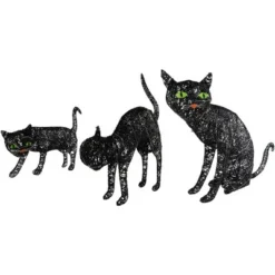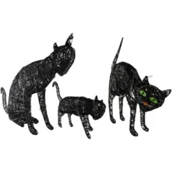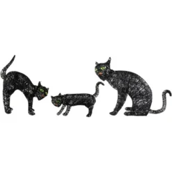 Create a hauntingly cute scene on your lawn or porch with this set of three LED lighted black cat Halloween decorations. These glowing feline figures instantly elevate your Halloween setup with their playful yet spooky silhouettes. Each cat in the trio is uniquely posed to form a charming black cat family, making them a standout addition to your Halloween outdoor decor. Crafted with durable black mesh material, the cats are pre-lit with a total of 90 warm white LED lights, creating a soft, inviting glow that shines brightly after dark. The gentle illumination highlights each cat’s body shape and whimsical design, while the black finish allows them to blend seamlessly into a Halloween-themed environment. This lighted cat decoration set is designed for easy placement on lawns, pathways, porches, or patios. The lightweight construction ensures convenient setup and storage, while the included stakes and power cord make installation quick and reliable. Whether used alone or as part of a larger Halloween display, this LED cat family adds personality and brightness to your holiday decor. Perfect for cat lovers and Halloween enthusiasts alike, this glowing trio offers a fun and family-friendly way to welcome trick-or-treaters with a spooky-meets-sweet vibe. Product Features: Set of 3 lighted wire mesh outdoor black cats Pre-lit with 90 clear lights Bulb size: mini Bulb type: LED Each cat requires 3 ‘AA’ batteries – not included LED lights use 90 percent less energy and stay cool to the touchFor outdoor useLights per cat:Large: 35 lights Medium: 35 lights Small: 20 lights Dimensions: Large: 27.5″H x 21.25″W x 6.25″D Medium: 23.5″H x 19.75″W x 4.75″D Small: 21.75″H x 15″W x 3.25″D Material(s): polyester/wire/plastic/metalSet includes 1 of each design shown, for a total of 3 pieces