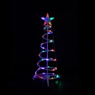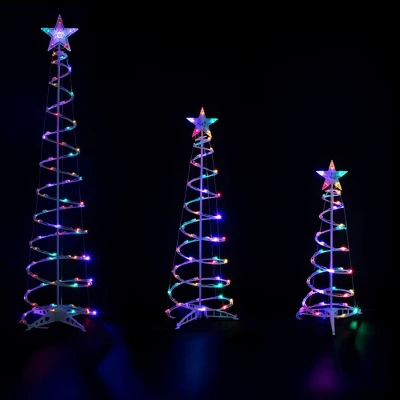 Create your own little holiday wonderland with our set of three multicolor spiral holiday trees. In graduated heights of 3’, 4’ and 6’, these cheerful lighted outdoor trees feature bright, energy-efficient and long-lasting LED bulbs in shades of red, blue, orange, yellow and green, topped by multicolor crystalline stars. Spiral trees assemble quickly and come with ground stakes for added stability outdoors. Bring joyful color to your holidays with a set of outdoor holiday trees that’s sure to charm!Product Features:Color: multi-color bulbs / white wire Multi-color consists of red, orange, amber, blue and green bulbsNumber of bulbs: 35, 50 and 80Bulb size: concave wide angle Bulb type: LED60″ white lead cord Quick and easy assembly Additional Product Features:Lighted crystalline star tree topper 8 and 10-piece easy assembly (including stands)Includes poles with stands and ground stakesContains 1 plug with end connector, which allows you to connect multiple items together (not to exceed 210 watts) Comes with replacement bulbs and spare fuseLights are replaceable and interchangeableWire gauge: 22 120 volts, 60 hertz, .17 amps, 20.4 watts120 volts, 60 hertz, .26 amps, 31.2 watts120 volts, 60 hertz, .51 amps, 61.2 watts Dimensions: 3′, 4’ and 6′ high (from the base of the stand to the top of the trees)3′ tree has a 13” base diameter (at the widest point)4′ tree has a 16” base diameter (at the widest point)6′ tree has a 19” base diameter (at the widest point)Star tree topper dimensions for the 3′ and 4′ tree: 7″ high x 7″ wideStar tree topper dimensions for the 6′ tree: 8.5″ high x 8.5″ wideMaterial(s): glass bulbs/wire/plastic
