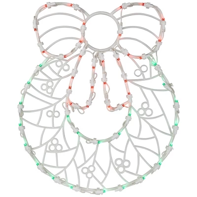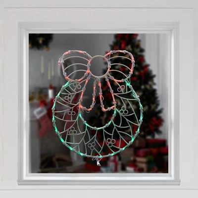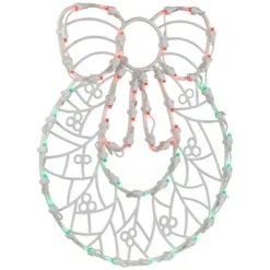 Add a touch of winter wonder to your holiday decor with our LED lighted holiday wreath window silhouette. This enchanting wreath silhouette will transform any window into a festive focal point. The warm, inviting glow of the lights will create a cozy atmosphere, perfect for celebrating the season with friends and family. Product Features:Color: green and red bulbs/white wire Number of bulbs: 50 Bulb size: mini concave wide angle24″ white lead cord Double sided design Fully assembled:suction cup includedAdditional product features: Super bright bulbsCool to the touch LED lights use 90% less energy UL certified and approved for indoor and outdoor useIf one bulb burns out, the rest will stay litComes with replacement bulbs and spare fuseContains 1 plug with end connector which allows you to stack multiple lighted items together (not to exceed 210 watts)Wire gauge: 22120 volts, 60 hertz, .15 amps, 1.5 wattsDimensions: 16″H x 13″W x 0.75″DMaterial(s): plastic bulbs/wire