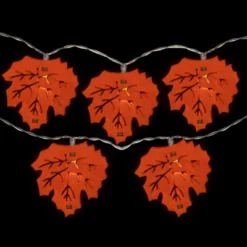 Celebrate the beauty of fall with our this fall harvest light set. These warm white lights adorned with delicate maple leaves bring the essence of autumn into your home. Battery-operated for easy placement, they emit a cozy glow that adds a touch of warmth to your fall decor. Illuminate your harvest season with these enchanting lights and enjoy the rustic charm they bring to your space.Product Features:Orange leaf designColor: warm white bulbs / silver copper wireNumber of bulbs on string: 10Bulb size: micro fairyBulb type: LEDSpacing between each bulb: 6″Lighted length: 4.5’Total length: 5.5’12’ lead cordAdditional Product Features:LED lights have 90% less energyDurable non-glass replaceable bulbsBulb stays cool to the touchUL certified and approved for indoor use onlyIf one bulb burns out, the rest will stay litCannot connect multiple sets togetherRequires 2 “AA” batteries; not includedConvenient on/off switch on the battery packMaterial(s): plastic/wire