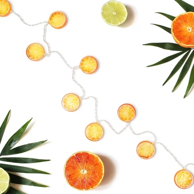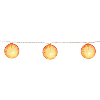 Bring a citrus-inspired glow to your space with these orange slice string lights. This 10-count set features LED warm white lights shaped like juicy orange slices, perfect for indoor or covered outdoor areas. Battery operated for easy placement, these string lights add a playful touch to patios, balconies, or kitchen decor. Whether you’re decorating for a summer gathering or simply enjoying a cozy evening, these citrus-themed string lights offer vibrant charm and convenience.Product Features:Color: warm white bulbs / clear wireOrange slice light coversBulb size: concave wide angleBulb type: LEDNumber of bulbs on string: 10Spacing between each bulb: 6″Lighted length: 4.5’Total length: 5.5’12” lead cordAdditional Product Features:LED lights use 90% less energyNon-replaceable bulbsCool to the touchUL certified and approved for indoor or outdoor useRequires 2 AA batteries – not includedConvenient on/off switch on battery packMaterial(s): plastic