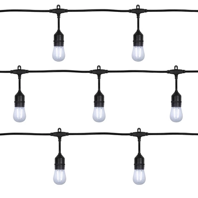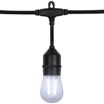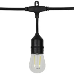 Light up your space with the enchanting glow of our clear LED S14 string lights. Perfect for creating a warm and inviting atmosphere. These string light bulbs are safe to use both indoor and outdoor and tested to withstand water and weather. Use them confidently, knowing they are WET rated and won’t break when exposed to moisture, snow or wind. Illuminate your world with style and charm with these timeless string lights.Product Features:Color: clear bulbs / black wireNumber of bulbs on string: 20Bulb size: S14Bulb type: LEDSpacing between each bulb: 9.5″Lighted length: 19.25’Total length: 20.5’11” lead cord5″ tail cordAdditional Product Features:UL certified and approved for indoor or outdoor useContains end-to-end connectors which allows you to connect multiple sets together (not to exceed 210 watts)