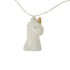 Add a magical touch to your space with these unicorn string lights featuring 10 white unicorns with shimmering gold horns. The LED warm white lights provide a soft, inviting glow—perfect for bedrooms, parties, or covered patios. These battery-operated unicorn lights are ideal for indoor or covered outdoor use, offering versatile decorating options. Whether you’re looking to enchant a child’s room or add charm to your patio setup, these whimsical string lights deliver.Product Features:Color: warm white bulbs / clear wire”Warm white” also known as “warm clear” has a soft natural incandescent glow, similar to candlelight Unicorn light coversNumber of bulbs on string: 10Bulb size: concave wide angleBulb type: LEDSpacing between each bulb: 6″Lighted length: 4.5’Total length: 5.5’12” lead cordAdditional Product Features:LED lights use 90% less energy Stays to cool to the touchNon-replaceable bulbsRecommended for indoor or covered outdoor useRequires (2) “AA” size batteries – not includedConvenient on/off switch on battery packMaterial(s): plastic