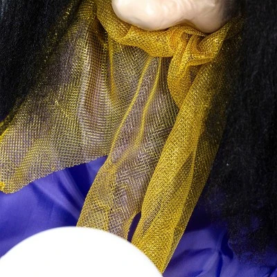 Add a mystical element to your Halloween decor with this lighted and animated fortune teller Halloween decoration. This enchanting figure instantly becomes the centerpiece of any spooky display, captivating guests with glowing lights and eerie motion. The fortune teller is dressed in traditional mystical garb, holding a magical crystal ball between her hands. As the ball lights up in vivid shades of purple, blue, and green, it creates a supernatural ambiance perfect for haunted houses, parties, or porch displays. Her lifelike animation brings an extra level of intrigue, with subtle movements that draw attention and build anticipation. Whether placed near your front door to welcome trick-or-treaters or set indoors as part of a haunted fortune-telling setup, this Halloween fortune teller decoration adds an irresistible air of mystery. Crafted with detailed features and durable materials, this animated Halloween prop is built to last through many spooky seasons. The multicolored lights and realistic design make it ideal for enhancing both indoor and covered outdoor spaces. A must-have for lovers of the paranormal, this fortune teller Halloween animatronic adds charm, excitement, and a touch of the unknown to your seasonal collection. Invite the spirits in and let her reveal your Halloween fate!Product Features:The magic ball glows with shifting shades of purple, blue, and greenThe fortune teller’s head sways with unsettling realism as she delivers spine-chilling predictionsEyes light up a bright redRequires 3 “AA” size batteries – not includedConvenient on/off switch on battery packRecommended for indoor use onlyDimensions: 20″H x 19″W x 16″DMaterial(s): polyester/plastic