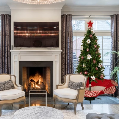 Is there anything more alluring than this lighted and musical holiday tree? Designed with artificial blowing snow, ornaments, flowers, and a star tree topper, this tree will decorate your home perfectly. The complete package for holiday displays year after year.Product features:Tree has green branchesCascading snowfall effectDecorative red, black and white umbrella base catches the falling snowBase has a plaid design with snowflakes and Reindeer Plays 25 classic holiday tunesIncludes shatterproof red ball ornaments with white designsAlso includes a red star tree topper and flowersAdditional Product Features:Comes with a string of 80 pure white LED lightsBulb size: concave wide angleControl box allows you to have the lights on with or without the musicSnowfall intensity can be controlled using the functional control box6′ AC adapter includedAdapter input: 120 volts, 60 hertzAdapter output: 12 volts, 1000 milli-ampereAdapter is class 2 power supplyAssembly required (instructions included)UL certified and approved for indoor useDimensions: 6′ high (from the base of stand to the top of the tree)Material(s): PVC/plastic/metal/wire/fabric/foam
