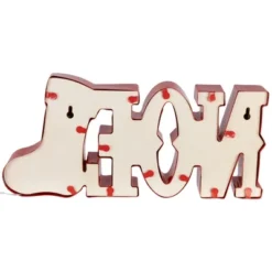 Glowing with festive charm, our lighted tabletop holiday sign adds a touch of holiday magic to any space. Crafted with care, the word “Noel” emerges in bold block letters, with the ‘L’ cleverly formed by a classic holiday stocking. Adorned in a rich shade of red and softly illuminated by warm white lights, this delightful decoration brings joy and cheer to your seasonal decor. Whether displayed on a mantel, shelf, or tabletop, it’s sure to spark the spirit of the season and create a merry ambiance for all to enjoy.Product Features:Lighted holiday tabletop decorationPre-lit with 17 warm white lightsShowcases “Noel” in block lettering with a stocking as the “L”Required 3 “AA” batteries; not includedOn/off switch located on the backFor indoor use onlyDimensions: 7.5″H x 16″W x 2″DMaterial(s): metal/plastic