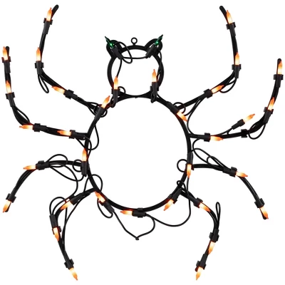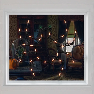 Creep out your Halloween decor with a chilling glow using this black spider shaped Halloween window silohuette. Designed to make a bold impact, this eerie silhouette features a large spider decoration crafted from durable black plastic framing and illuminated by 35 super bright orange and green incandescent bulbs. The glowing eyes and vibrant outline give it a sinister vibe that’s ideal for front windows, porches, or any indoor wall needing a spooky upgrade. Each bulb casts a vivid glow that cuts through the dark, making the spider visible from the street and drawing in attention from trick-or-treaters and party guests alike. The black frame blends into nighttime settings, allowing the lights to shine even more vividly against the glass. The flat-backed silhouette makes installation easy on any window or wall using suction cups or hanging hardware. This Halloween spider light decoration is a standout option for themed lighting displays, haunted houses, or Halloween parties. The combination of green and orange bulbs creates an unmistakably seasonal effect, while the iconic spider shape adds a creepy element to your Halloween ambiance. Plug it in and light up the night with eight legs of glowing fright—an ideal choice for a fun and spooky atmosphere.Product Features:Color: orange and green bulbs / black wireNumber of bulbs: 35Bulb size: mini24″ lead cordAdditional Product Features:Super bright bulbsUL certified and approved for indoor or outdoor useIf one bulb burns out, the rest will stay litComes with one suction cup, replacement bulbs and a spare fuseContains 1 plug with end connector which allows you to stack multiple lighted items together (not to exceed 210 watts)Wire gauge: 22120 volts, 60 hertz, .12 amps, 14.4 wattsDimensions: 15″H x 15″W x 0.25″DMaterial(s): plastic/wire/glass bulbs