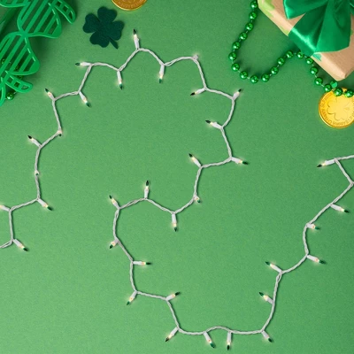 Brighten up your space with this versatile 100-count mini holiday light set. Featuring clear bulbs and green tips, it’s a festive choice not just for holiday but also for St. Patrick’s Day. Whether you’re decorating a tree, draping a mantel, or adding sparkle to your St. Patrick’s Day celebration, these lights offer a warm and inviting glow that complements any occasion.Product Features:Color: clear bulbs with green tips / white wireNumber of bulbs on string: 100Bulb size: miniBulb type: incandescentSpacing between each bulb: 2.5″Lighted length: 20.25’Total length: 21.5’12” lead cord3″ tail cordAdditional Product Features:UL certified and approved for indoor or outdoor useIf one bulb burns out, the rest will stay litLights are equipped with Lamp Lock feature, which makes them replaceable, interchangeable and keeps them from falling outComes with replacement bulbs, flasher bulbs and spare fusesContains end-to-end connectors which allow you to connect multiple sets together (not to exceed 210 watts)Wire gauge: 22120 volts, 60 hertz, .34 amps, 40.8 watts
