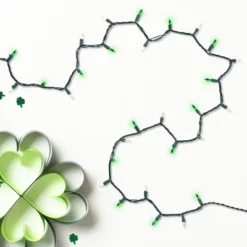 Brighten up your holiday season with this 50-count mini holiday light set, featuring a classic combination of green and clear bulbs. Ideal for adding a festive touch to your holiday decor, these lights are also perfect for celebrating St. Patrick’s Day with a splash of green. Easy to use and versatile, they’ll bring cheer to any occasion throughout the year.Product Features:Color: green and clear bulbs / green wireNumber of bulbs on string: 50Bulb size: miniBulb type: incandescentSpacing between each bulb: 2.5″Lighted length: 10’Total length: 11.25’12” lead cord3″ tail cordAdditional Product Features:UL certified and approved for indoor or outdoor useIf one bulb burns out, the rest will stay litLights are equipped with Lamp Lock feature, which makes them replaceable, interchangeable and keeps them from falling outComes with replacement bulbs, flasher bulbs and spare fusesContains end-to-end connectors which allow you to connect multiple sets together (not to exceed 210 watts)Wire gauge: 22120 volts, 60 hertz, .17 amps, 20.4 watts
