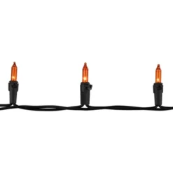 Create the perfect spooky glow with these Halloween string lights featuring 50 bright orange incandescent mini bulbs on a black wire. Designed with classic Halloween colors, this light set has a 10-foot lighted length with bulbs spaced 2.5 inches apart for even, consistent illumination. The black wire blends seamlessly into dark settings, making the orange Halloween lights pop for a bold effect. These Halloween mini lights include a 12-inch lead cord and 3-inch tail cord for easy setup, plus end-to-end connectors that let you safely connect up to 10 sets together. If one bulb goes out, the rest stay lit for continuous, reliable lighting. The Lamp Lock feature keeps bulbs secure, while replacement bulbs, a flasher bulb, and spare fuses are included for long-lasting use. UL-certified for indoor and outdoor Halloween decorations, these mini string lights are perfect for railings, porches, windows, mantels, wreaths, garlands, and Halloween parties or haunted houses. Their vivid orange glow creates the ultimate eerie atmosphere, whether you’re decorating a yard display, a haunted attraction, or adding festive flair to your home. These orange incandescent Halloween lights aren’t just for October – they’re also versatile for holiday decorating. Use them for holiday lights, autumn decor, or year-round accent lighting. Durable, festive, and easy to install, this 50-count light set brings a classic touch of Halloween spirit to any space.Product Features: Color: orange bulbs / black wire Number of bulbs on string: 50Bulb size: miniBulb type: incandescentSpacing between each bulb: 2.5″ Lighted length: 10′ Total length: 11.25’12” lead cord3″ tail cordAdditional Product Features: UL certified and approved for indoor or outdoor useIf one bulb burns out, the rest will stay litLights are equipped with a lamp Lock feature, which makes them replaceable, interchangeable, and keeps them from falling outComes with replacement bulbs, flasher bulb, and spare fusesContains end-to-end connectors which allow you to connect multiple sets together (not to exceed 210 watts, up to 10 sets)Wire gauge: 22120 volts, 60 hertz, .17 amps, 20.4 wattsMaterial(s): glass bulbs/wire/plastic