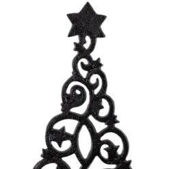 Crafted with elegance in mind, this set of two trees boasts a striking solid black cut-out swirl and stars design, adding a touch of sophistication to any space. Each tree rests securely on a sturdy wooden base, ensuring stability wherever you place them. Ideal for indoor use, these decorations are perfect for adorning tables, shelves, or mantles, infusing your home with festive charm and timeless style.Product Features:Set of 2 holiday tabletop trees Elegant cut-out textured swirl and stars designEach tree comes on a sturdy non-slip wooden baseIdeal for tables, shelves and mantelsRecommended for indoor decorative use only Dimensions: Large: 18.5″H x 7.5″W x 3.5″DSmall: 14.5″H x 5.5″W x 3.25″DMaterial(s): wood/metalNote: Set includes 1 of each size shown