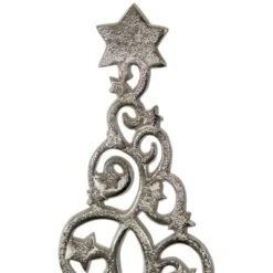 Elevate your holiday decor with this elegant set of holiday decorations. This set of two stunning trees boasts an elegant metallic silver cut-out swirl design, adorned with stars for a touch of celestial charm. Each tree comes with a sturdy wooden base, ensuring stability and durability. Ideal for indoor use, these exquisite decorations are perfect for adorning tables and adding a touch of festive sophistication to any space.Product Features:Set of 2 trees holiday tabletop decorationsElegant smooth and textured metallic silver swirl design adorned with starsEach tree comes with a sturdy non-slip wooden baseIdeal for tables, shelves and mantelsRecommended for indoor decorative use only Dimensions: Large: 18″H x 7.5″W x 3.5″DSmall: 14.5″H x 5.25″W x 3.25″DMaterial(s): wood/metalNote: Set includes 1 of each size shown