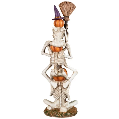 Bring some spooky-yet-silly fun to your Halloween decor with this 12.25″ stacked jack o’ lantern skeletons! This unique decoration features three skeletons playfully stacked on top of each other, each with a happy jack o lantern head. The top skeleton holds a “Trick or Treat” sign on a broom, adding a whimsical touch to this festive piece. Perfect for a tabletop, mantle or entryway. Product Features:Stacking pumpkin skeletons figureSmiling jack o lantern headsTrick or treat broom signRecommended for indoor use or outdoor under a covered areaDimensions: 12.5″H x 4″W x 3.25″DMaterial(s): polyresin