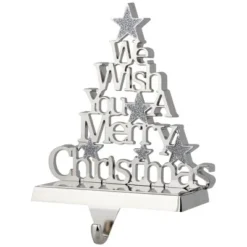 Celebrate the holiday spirit with a festive stocking holder that adds charm to your decor. Shaped like a holiday tree, the “We Wish You a Merry holiday” design is adorned with glittered stars, creating a sparkling centerpiece. Perfect for hanging stockings by the fireplace, this holder brings a joyful message and a touch of shimmer to your home.Product Features:Silver holiday stocking holderWeighted base for added stabilityNon-slip fabric beneath the base1″ metal hanging hookRecommended for indoor use onlyDimensions: 6.25″H x 5.5″W x 2.5″DMaterial(s): metal